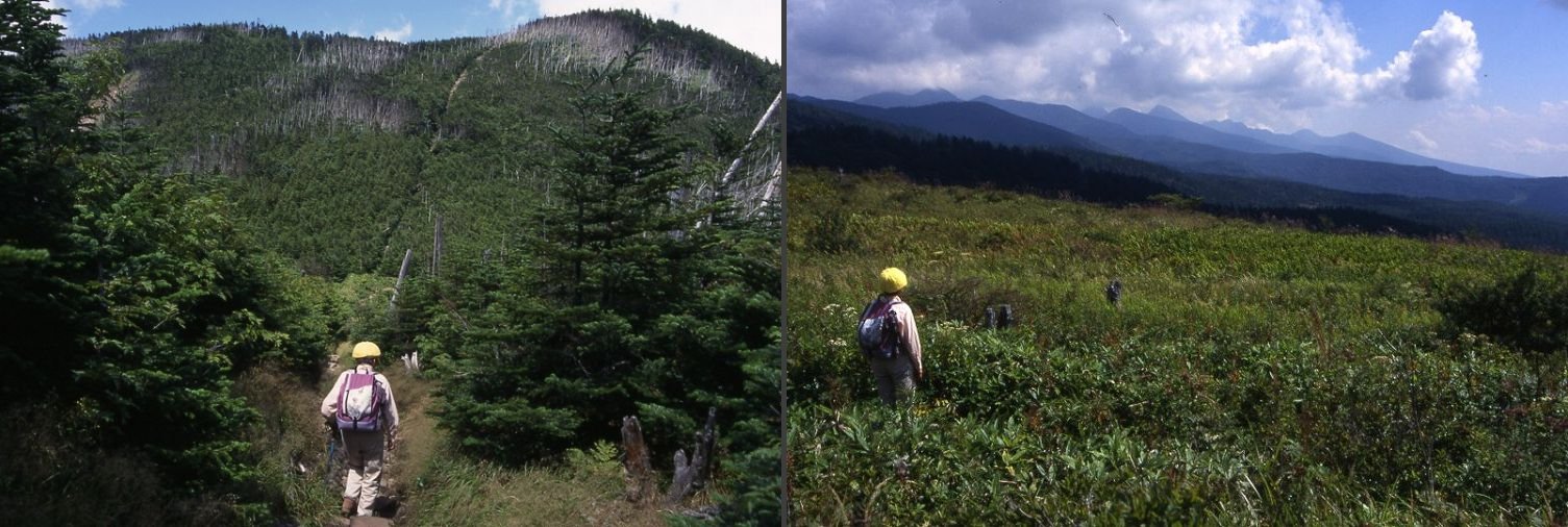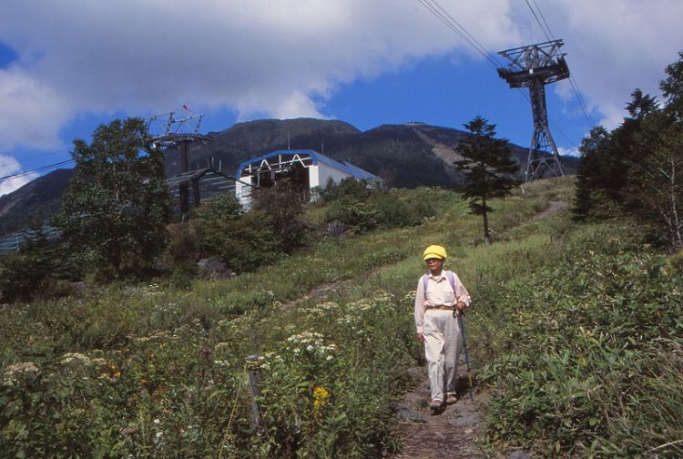 これが忘れられずに、今から3年前の2015年の初秋、登りはロープウェイ、くだりはこの道を歩いてみれば、昔と今では大違い。周りの景色はけっこうとしても、道には大小の石ころが転がっていて歩きにくいことおびただしい。「前はこんなことはなかったのに」とぼやきながら、やっとの思いでくだった。脛はみしみしいうし、痛い膝がなおさら痛くなった。この足の痛さと大草臥れの原因は2015−1997=18という年月のせいかも知れず、60代と80代とでは大違いなことを身に沁みて思い知らされた。とはいうものの、W雀、百までW。これより左側に付けられたスキーコースの草付き斜面を選べば足元も柔らかで、なんとか歩けるのではないだろうか。しかし、今、長沢さんにそれをいえば、必ずや「性懲りもなく!!、もう、いい加減でやめたほうがいいですよ」とおっしゃるに違いない。 (2018.9) |