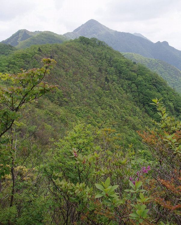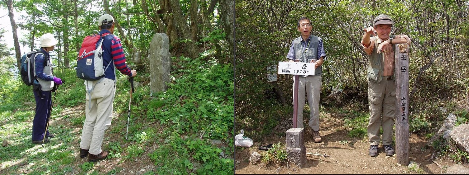 前日は臨幸峠に往復して、その夜はロッジ泊。二日目はこの木曜山行に加わって、精進-女坂峠-王岳-鍵掛峠-根場と歩いた。写真は女坂峠での渡邉玉枝さんと坂本桂さん、王岳山頂の冨田雄一郎さんと木村久男さん、南から見た尖峰王岳1623bの計3枚。新緑とミツバツツジが美しい日だったと覚えている。それからは13年、今に至るも王岳のお二人は元気一杯、よくお登りです。また、お口のほうもお変わりないようと拝察しています。