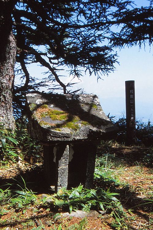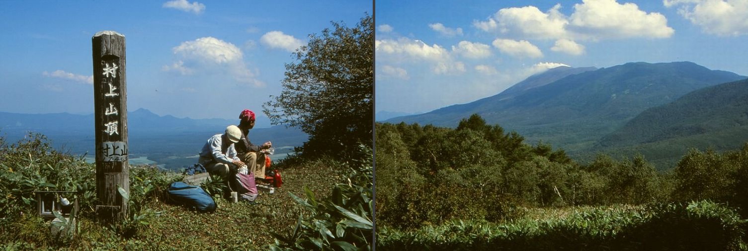 湯ノ丸山2015bと篭ノ登山2228bとの間にあるのが地蔵峠で、この峠を長野県から群馬県へ越して間もなく、湯尻川の右岸に桟敷山1931bと小桟敷山1852b、それに村上山1746bがほぼ一塊になっている。公共交通に頼っていては行きにくい山だが、それを日帰りで登ってこられたのも、寺田君の車があればこそ、だった。いったん山へ取り付いてしまえば、桟敷山、村上山ともに、それほどの時間もかからずに登れる山だった。展望は桟敷山(小石社がある)よりも村上山のほうが闊達で道々浅間山が大きく見えていた。その写真で標柱のすぐ右に見える三角峰は、多分、浅間隠山1757bであろう。なお、この時は小桟敷山は割愛したが、2014年7月に当ロッジご主人の先導で桟敷山と合わせて登っている(小棧敷山)。村上山には2008年の10月に島田ご夫妻と再度登っていて、この時は霧に滲む紅葉がきれいだった。さらに付け加えれば、寺田君と桟敷山へ登ったこの日、途中から湯尻川の対岸に角間山1981bに続く緑の尾根が実に魅力的に見え、「いつか、あれにも登りたいね」といっていたが、ついに彼とは登る機会を逸してしまった。角間山には2013年の初夏の好日、やはりロッジご主人の驥尾に付して登ったが(角間山)、「ここに寺田君がいれば」と残念だった。 (2018.11)