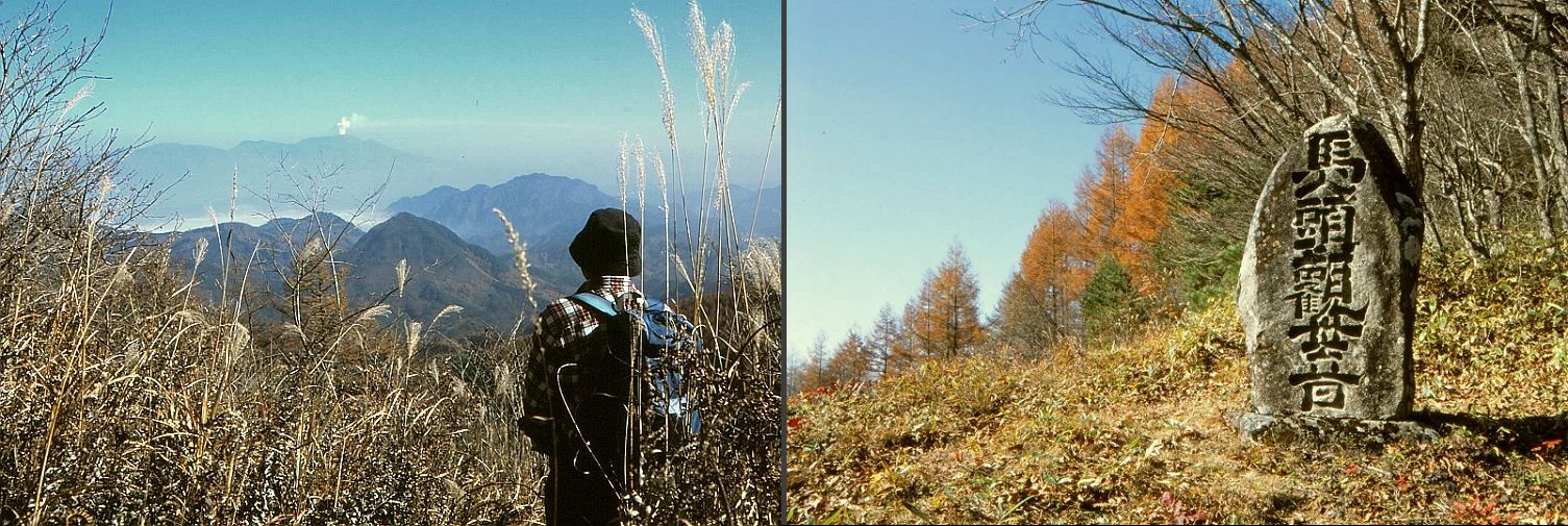 今はいざ知らず、この時は峠からの眺めは周りの林にさえぎられて皆無、二ッ石峰に登って初めて北アルプスの連なりを見ることができた。しかし、それも林のすいた間からの、広々とした大展望ではなくて、もう一つ不満が残った。私としては、むしろ登山道の途中で得られた上田側の眺めのほうが感激で、岩瀬さんを前景にした噴煙たなびく浅間山の写真は、その日と岩瀬さんを思いだす1枚となっている。なお、峠へ戻って一休みしている時、車道の向こうに小さな標識らしきものを見つけた。行ってみると「ウォルターウェストン 日本アルプス絶賛の地入口」とある。山が見えるのかもしれないと少し行ってみると、眺めは云うほどのものではないが、大きな石造りのウェストン絶賛の地の記念碑があったのにはびっくり。「えらいものがあったよ」と、みなを呼びに行き、記念碑の前で、こちらの記念写真を写した。それにしても、これだけのものを手間暇と大金かけて造ったならば、ただ「絶賛の地入口」だけではなく、記念碑があることを教えておいてもよいのではないだろうか。峠そのものの上では、落葉松の黄葉を背景の馬頭観音碑がなかなかだった。 補記 1.「午下がりの夏の日がカッと照りつけていた。四五〇〇フィートの峠の峰に着いたのは午後六時。尾根の窪みの左側に小さな円丘があって、その上に立つととつぜん目の前に憧れの大山脈が姿を現した。まったく予期しない眺望の展開だったから、そのすばらしさにただただ驚くばかりだった。……日本のマッターホルンともいうべき槍ヶ岳や、ペニン・アルプスの女王ワイスホルンを小さくしたような、優美な三角形の常念岳、それからはるか南にどっしりとした乗鞍岳の双子峰。それぞれ特徴のある山の姿が私の目にやきついた。」(『日本アルプスの登山と探検』ウォルター・ウェストン著、青木枝朗訳/岩波文庫)。 2.この8年後の2012年の10月4日、当ロッジご主人の車で富田雄一郎さん、木村久男さんとともに、再度、保福寺峠、二ッ石峰を訪れる機会を得た(参考)。初秋の好日だったが、二ッ石峰からの北アルプスはぼうっとした青空に溶け込んでいて、あまりよくは見えなかった。前とは逆方向の松本側からの往復で、帰りには保福寺町、保福寺道、保福寺峠などの名の因になった保福寺に立ち寄った。山号を永安山といい、山門の脇に大ワラジが吊るしてあるなど、いかにも街道(東山道)筋にある寺のたたずまいだった。 (2018.12) |