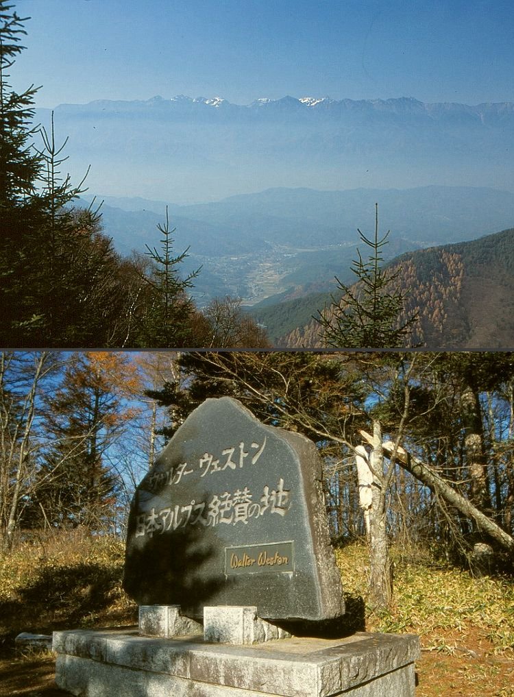 よく晴れた秋の一日、ウェストン師ゆかりの保福寺峠に行き、ついでに近くの二ッ石峰1563.3bにも登ってきましょうと、岩瀬晧祐さん(既出)が車を出してくれて、大森久雄さんと私たち二人、北アルプスの眺めが素晴らしいというこの峠へ、かつてのウェストンさんと同じように、私たちも上田側からあがっていった。ただし、明治24(1891)年8月2日の強烈な日差しの午後、ウェストンさんが汗を拭き拭き(に違いない)歩いて登った峠道を、113年後の今日は車に座ったままの楽ちん極まりない超特急、おまけに「さっき、道の駅で買ってきた岩瀬さん推奨のWまい泉Wのカツサンド、ほんとにおいしそうですね、お昼はどこにします、早く食べたいですね」なんて、好き勝手をいっている。