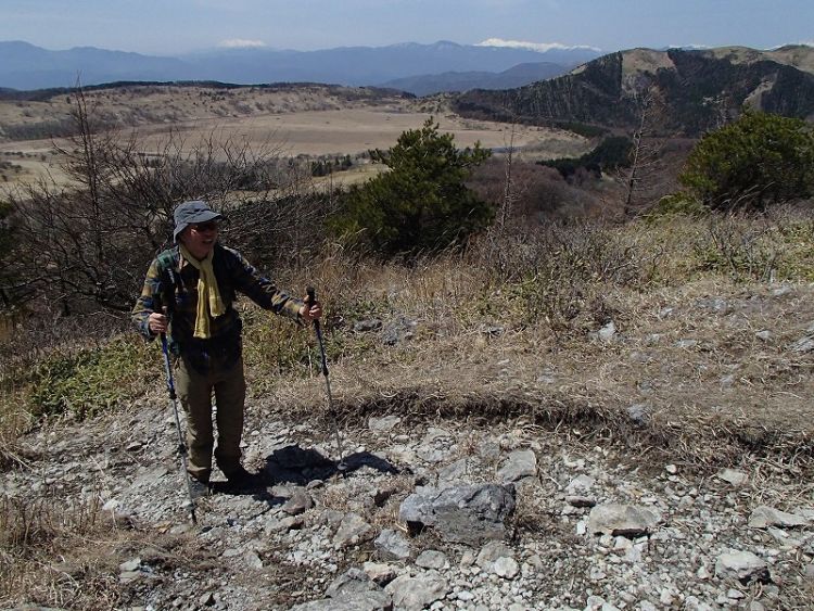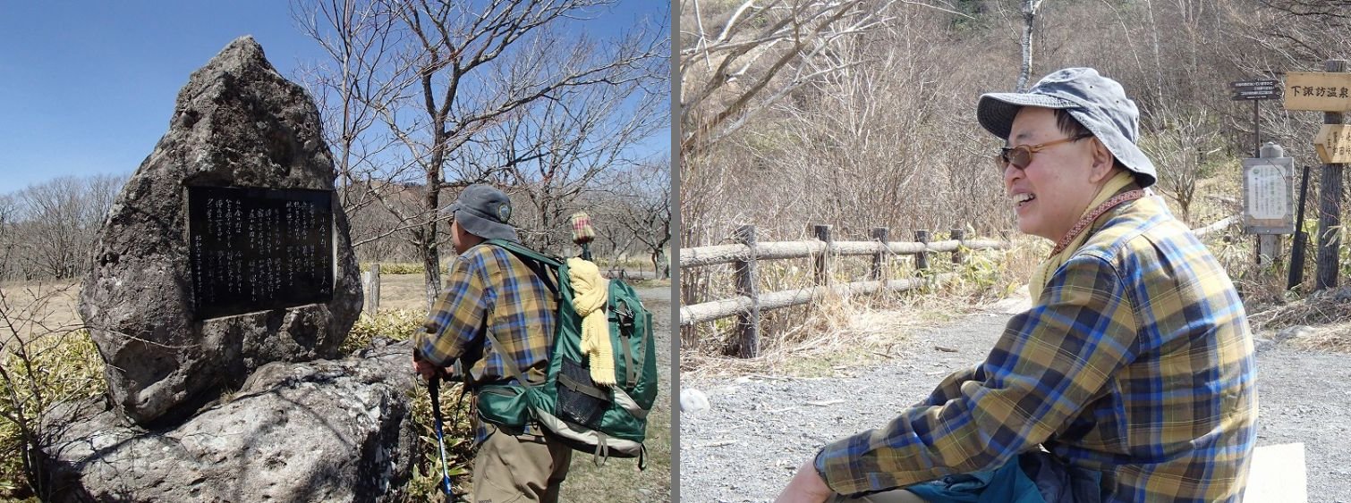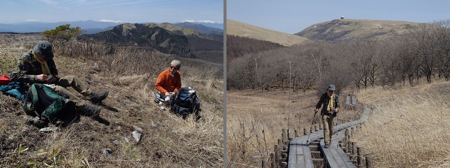澤二さんとの山行はみな鮮明に記憶に残っているが、その中でも、このゼブラ山と八島湿原を歩いた日のことが、「あの時は4月にしては稀有な遠望に恵まれて」と、いっそう懐かしく思い出されてくる。「澤二さん、長沢さん、楽しい山歩きでしたね、御岳や乗鞍、北アルプスの山々はまだ真っ白だったし……」。 なお、ここに載せる写真はいつもは3枚ときめているが、今回だけは5枚とし、一昨2018年4月16日、「お召し列車」で藤野下車、石楯山‐一本松山‐京塚山と歩いた折の1枚を加えておいた。それは私の最後に写した澤二さんで、みな、澤二さんを想っての写真である。 (2020.5.21)