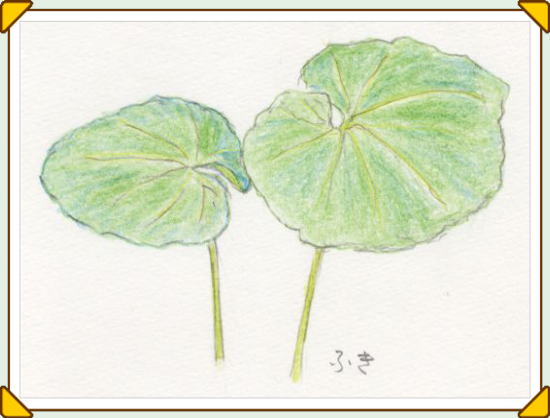 | ふきのとうは、残雪が消える頃になると終りになってしまうが、ふきの葉と茎は、初夏のころまで楽しむことができる。 ふきも北方系らしく、山形の翁山や杢蔵山のあたり、広々と高原状の尾根の上全体が、ふきの葉でおおわれて、風にひるがえっていた情景が、いまも目にうかぶ。 傘の代りになりそうなほど大きくなるものもあるが、山で採ってくるのは茎の長さ30〜40センチ、葉の差渡し20〜30センチぐらいまでが扱いやすい。大きめのものは八百屋で買うものと同様、茎を塩で板ずりして、ゆで、水にさらして皮をむけば、色々の料理に使えるが、わたしは、葉のほろ苦さが好きなので、あまり大きくないものを、茎も葉も一緒にゆでて、水につけ、むける所は皮をむいて、葉は放射状に破って細かくきざむ。それを、きつくしぼって水気を切り、酒としょうゆで煮る。水分がなくなるまで煮ると、ある程度日もちする。好みで唐辛子を入れてもよし、昆布、椎茸などを一緒に煮て、吹き寄せとしゃれてもいい。 |