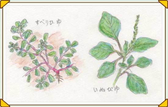 どちらも、ごくありふれた雑草で、街中でも目にする機会はあるはずだが、意識してみたことがある人は、それほど多くないのではないだろうか。 すべりひゆは、乾燥に強く炎天下の庭の隅や、畠の周囲などに、四方に這うように広がっている。近年、夏の鉢花などとして、園芸店や花屋でよく見かけるポーチュラカという草花がある。花は昔懐しい松葉牡丹にそっくり、茎と葉はすべりひゆによく似ているので、調べてみたら同じスベリヒユ科だった。ポーチュラカをご存知の方は、それに似た雑草を捜せば簡単に判るのではないか。ただしすべりひゆの花は同じ5弁花だが、ごく小さい黄色で目立ない。 わたしは、山菜としてのすべりひゆを『山のごちそう』渡辺隆次(ちくま文庫)で知ったのだが、最近知りあった美容師さんが、山形県の出で、「ひょうと称んで、郷里ではお浸しや、芥子じょうゆでよく食べます」と話してくれた。 『山のごちそう』に紹介されているように、ゆでた茎を干して保存し、それを戻してベーコンといためたり、油揚や椎茸と煮物にするという調理法も、しゃれていて、おいしい食べ方だ。 いぬびゆは、ひゆという名が似ているが、全く別のヒユ科の草で、道路端や狭い空地などでも、たちまち1メートル近くまでこんもりと茂ってしまうような、たくましさがある。 |