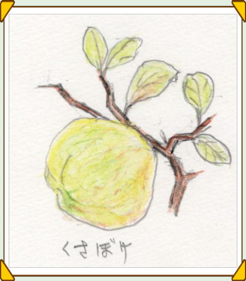 | くさぼけ(しどみ)も、早春の花どきは、その明るい朱色が目だつので、簡単に見つかるが、初秋に実を捜すのはちょっとむずかしいかもしれない。花を見た覚えのある辺りで、足もとの草の中を探ってみると、プラムほどの実が1、2個は見つかるのではないだろうか。 実が少し黄ばんできたころが採りどきで、数個もあれば焼酎などに漬けて果実酒にすることができる。1個だけならば、薄くスライスして紅茶に浮かせると、レモンティーと同じように味わえる。 ボケは庭木や鉢物として植えられた栽培物にも実がなるので、そちらも同じように使うことができる。 わたしが最初に覚えたのは、祖母の庭になった実を浮かしたボケティーの味だった。 |