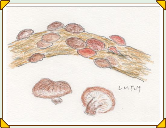| 天然のしいたけは日光の高山の登りで倒木の上に列をなして生えているのを見つけたのが最初の出合いだったと思う。その時は背負っていたザックを放りだして夢中で採った。栽培ものよりもずっと香りが高く、とてもおいしかった。 しいたけは条件がととのえば、秋ばかりでなく春にもでるので、採取する機会は多い。また、各地で栽培されているので、林の中などに、古い腐りかけのほだ木が山積みに捨てられていることがある。そのほだ木から大きなしいたけが、たくさん顔をだしていて、ありがたくいただいて帰ったこともある。 沢に架かった橋の真中に1本だけ生えていたこともあるし、立枯れの木のやっと手が届くほどの高い所に、掌ほどの大物を見つけたこともある。 |