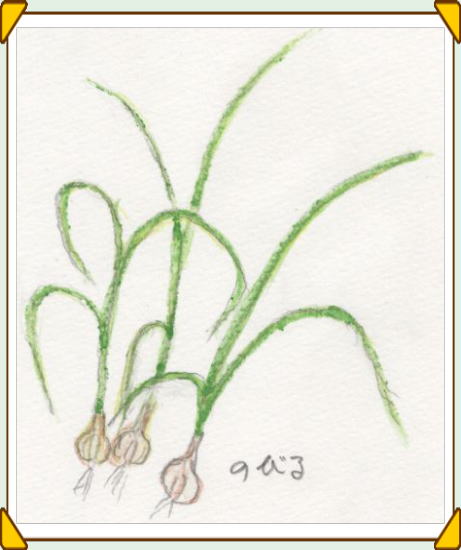 | のびる(野蒜)は山道のかたわらや庭の隅など、見かけることの多い野草だ。 2月初旬の奥武蔵の丸山からの下り道でも日向に糸のような細い葉を伸ばしているのを見た。土の柔らかい所のは気をつけてそっと引き抜くことができるが、道端などのは土がかたく、道具がないと掘り採るのはむずかしい。 葉は中空で、切り口は三日月形をしている。玉っころのような球根は、1.5cmほどと小さい。葉はきざんで薬味に、生の根はとても辛いが、味噌をつけて酒肴に好む人も多い。 葉も球根もゆでて酢味噌和えがよいが、春先は貝類の味がよくなるので、アサリなどと一緒に和えればさらにおいしくなる。 |