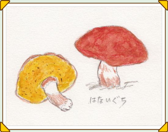 | はないぐちは落葉松林に生える。傘の裏がひだでなく、スポンジのような管孔になった茸の仲間だ。 最初にこの茸を見たとき、わたしはどら焼きの皮を思い浮かべた。傘の表側はこんがり焼けた狐色、裏はやや鈍い黄色でプツプツと孔があり、大きさも直径7〜8cmだった。 奥秩父、笠取小屋の田辺正道さんに「この辺じゃ、じこぼうという」と教えられた。同じイグチの仲間にはヌメリイグチなど何種類かあるが、どれもじこぼうとひとくくりにしていっていたようだ。 はないぐちは、汁の身にしても鍋物に入れてもよいが、わたしは茹でて小さめに切り、おろし和えで食べるのが好きだ。 傘裏の管孔部が消化しにくいといって、むいて捨てる人もあるが、あまり気にすることはないと思う。 私がおぼえたころは、傘の裏が網や管孔になった茸には毒はないといわれていたが、その後、この型の茸のなかにも有毒なものが見つかっているので注意が必要だ。 |