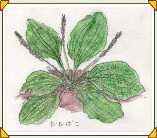 | おおばこ(大葉子、車前草)も、どこにでも生えている草の最たるもの。市街地から山の上まで人の通る道端なら必ず見つけることができるほどの、ありふれた草だ。 おおばこは踏みつけられて育つ草だという。よく踏まれる所ではほかの草が育ちにくいので、そこに勢力圏を築くのだそうだ。そのうえ種子はゼリー状の粘着物を持っていて、靴の底や車のタイヤにくっ付いて色々な場所へひろがって行くのだという。そして、よい場所に育ったものは、名のとおり、びっくりするぐらい大きな葉をつける。 6月頃、奥秩父の笠取小屋周辺で、そんな大きなおおばこをたくさん見た覚えがある。 おおばこは、きずのない柔らかそうな葉を選んで採り、茹でて冷水でさらし、炒めもの、煮もの、和えものにする。 |