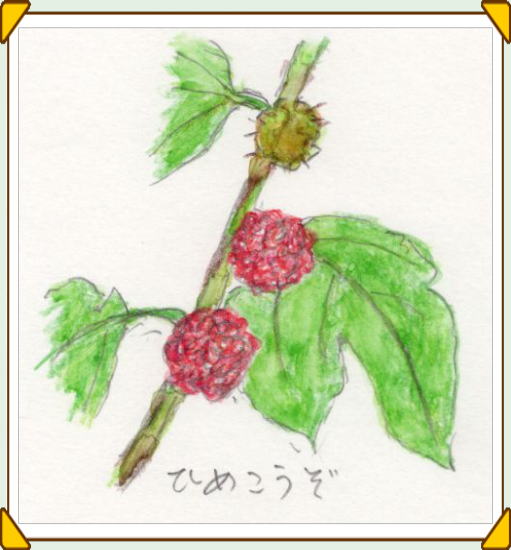ひめこうぞ(姫楮)は、昨年7月の初めに、中央沿線の里山歩きの折に見つけた。 川を渡った車道が大きくカーブしながら登っていく道路の法面に、桑に似た潅木が多く生えていて、赤いガラスビーズを集めたような実がぽつぽつとなっていた。 熟していそうな一粒を口に入れてみると、甘い汁がジュワーと出たが、ざらついた感じが舌に残った。 家に帰って調べると、クワ科のヒメコウゾと出ていて、和紙の材料として知られるコウゾは、これの栽培種であり、近い仲間のカジノキ(梶の木)にも、もっと大形の同じような実がつき、それも食用になることが判った。 ざらざらと口に残るのは雌しべで、これを濾してジャムやジュースにするとよいそうだ。 |