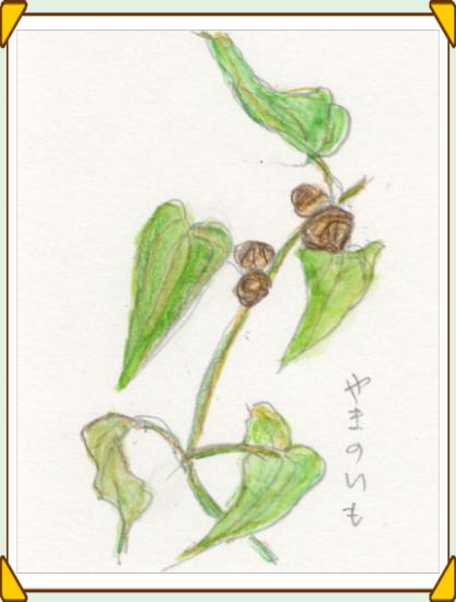 やまのいも(山の芋) 山・野に自生するから、やまのいも、じねんじょ(自然薯)ともいう。 わたしが子供の頃には家の庭の隅などにも細い小さいのが生えていた。この種子が茶色に枯れて半透明の半月の翼を3枚開いたような形になったのを、鼻の頭に貼って天狗の鼻と遊んだのを覚えている。 この根っ子は丁寧に掘り取れば、とろろとして食べることができるが、野生のいもは細いうえによじれたりまがったりして、折らずに掘るには道具と技術と、相当の労力、時間が必要だ。 昔、苗場山からおりて泊まった逆巻温泉で、朝食に、やまいものすりおろしが1皿出た。かなり濃い灰褐色で、つやのあるもちもちとしたかたまりであった。箸でちぎろうとしても簡単ではない。 「これなんですか」と聞いて「やまのいもですよ」とおしえられたのだが、栽培物のとろろ芋とは全く別物の観があった。 やまのいもには、むかご(零余子)もできる。 むかごは、葉のつけ根にできる珠芽で、ユリの仲間などにも出るが、普通むかごといえば、ヤマノイモのものを指す。大は親指の先ほどから小は小豆ぐらいまで、極小の馬鈴薯のような姿をしている。 これは見つければ簡単に取ることができる。から炒りして塩をふってもよいし、しょうゆをからめてもよい。他には炊き込みご飯が一般的かもしれない。 |