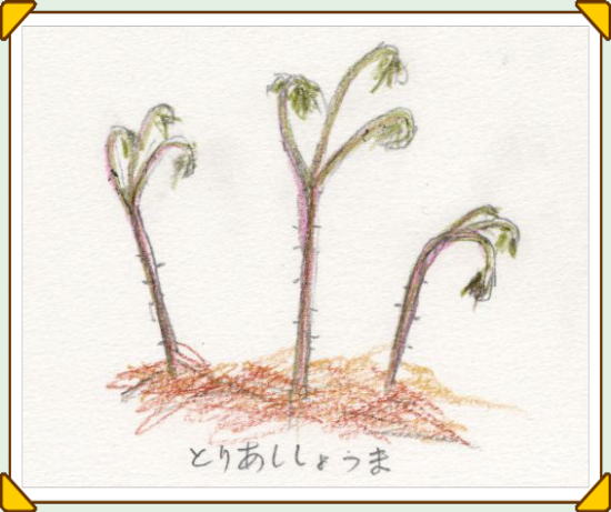 | v とりあししょうま(鳥足升麻)は、3本に分かれた細い茎の先に、ちょっと下向きに赤っぽい新芽が開きかかっている姿が、まさに逆さにした鳥の足である。 山の雑木林の中の巻き道など、その横の斜面にぽつぽつと芽をだしているのに気付くことが多い。 湿り気のある所が好みらしい。雪の多い東北の低山では、丈も高く太いものが採れるが、東京周辺の山ではあまり大きくはならずに葉がひろがってしまう。 葉が開かない、鳥足の形がはっきりしている時期が食べごろで、これを過ぎると硬くなってしまう。 丈の低いものは姿のままの天ぷらがよいだろう。油に合うので炒めものもおいしい。茹でて冷水に取り、ごま和えなどにしても食べられる。 |