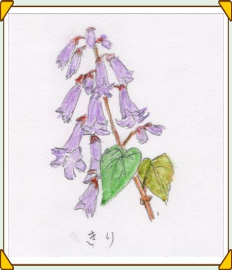 きり(桐・梧桐)は、昔は東京の住宅地でも庭木として植えられていて、よく目にする花だった。 いまは中央線の沿線でも少し山間に入らないと見られなくなったが、それでも5月の車窓からは樹冠を薄紫に染めた桐の大木を時折見ることができる。 喜多方は 蔵多き町 桐の花 桐咲けり 冬は孤立の 集落に これはきりを詠んだ斗城・川崎精雄さんの句だが、会津や越後の方にはまだ多くの桐の木がありそうだ。 このきりの花がきれいな天ぷらになるという。 また、若い実に箸で幾つかの穴をあけて揚げることもできるとは、『食べる薬草事典』(村上光太郎/農文協)に載る料理法だ。 緑の山を幾つも/幾つも越えてきた/不意に山が切れて/海があった/ 青い海があった/海は白い波を立て/陸には桐の花が/咲いていた 一九六四年六月 平井賀にて 深田久弥 と、藍で染めたのれんがわが家にある。北国の6月はまだ桐の花の季節のようだ。 きりは葉や樹皮が漢方薬になり、材は軽くて狂いが少ないので、箪笥や琴の台、上物の下駄の台などに使われる。会津の山に行ったときに麓の町で、ざっと形取りした下駄の台を組み合わせ、塔のように積上げ乾燥させているのを見た。山登りをしていなければ、一生東京暮しの私などは、こんな情景を見ることはなかったろうと思った。 |