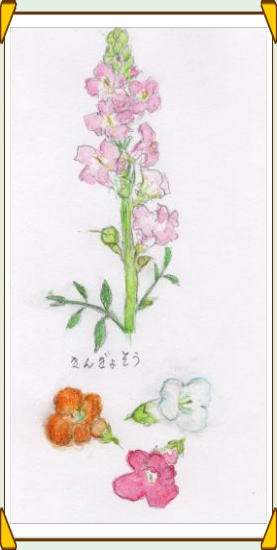 きんぎょそう(金魚草)は、ぷっくり、ひらひらと咲く花の形になぞらえたかわいい名だが、英名はスナップ・ドラゴン(Snap dragon)で、噛みつき竜とは恐ろしい。食材店でエディブルフラワーとしてほぼ一年中売られているが、個人の庭などで育てると4、5月頃が花期となる。 食用になるその花は、赤、桃、白、黄、橙など色も豊富で、ビタミンCを多く含み、味はちょっと苦味がある。軽く火を通す炒め物やサラダによく、和食の和え物の彩りとして一輪を添えたりする。 |
